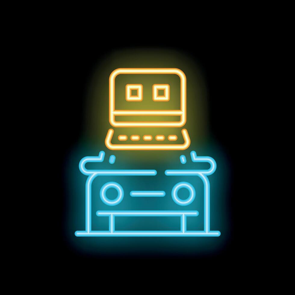 Neon icon of laptop using wireless network to connect with car system Pro Vector