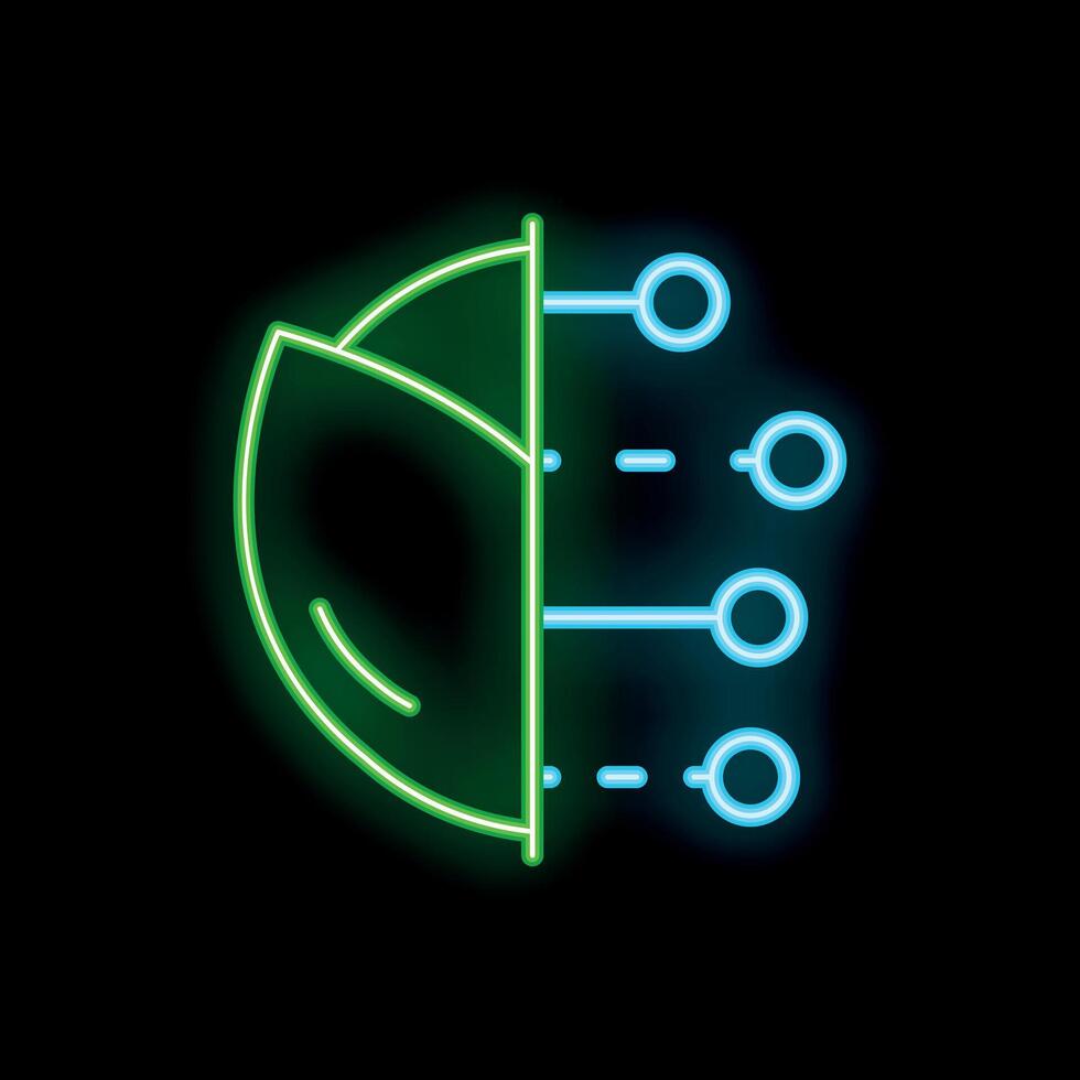 Neon icon of green leaf transforming into digital network representing digital ecology Pro Vector