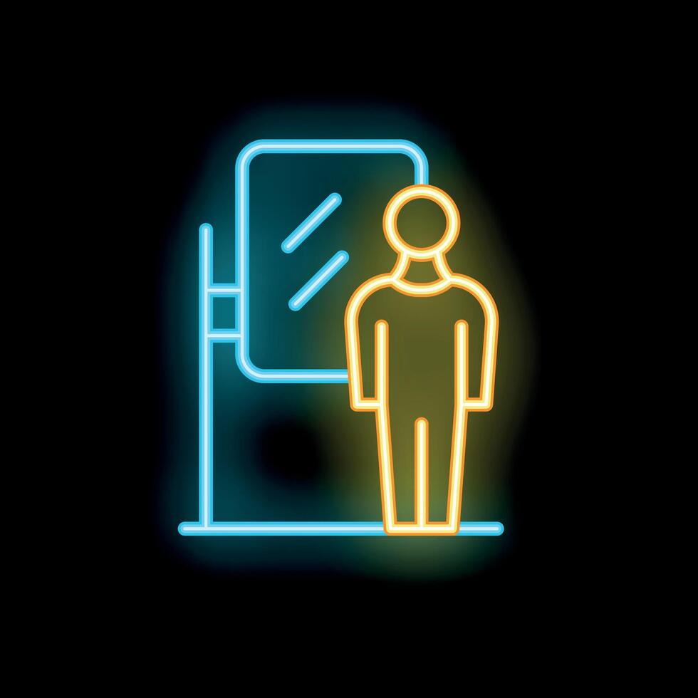 Neon icon of a man standing and looking in the mirror Pro Vector