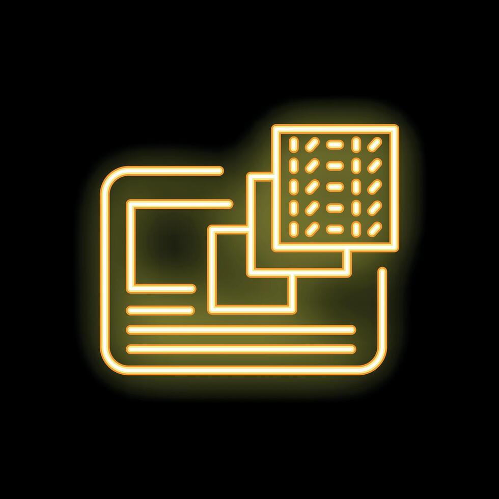 Bright yellow neon icon of a website layout with a design element on a black background Pro Vector