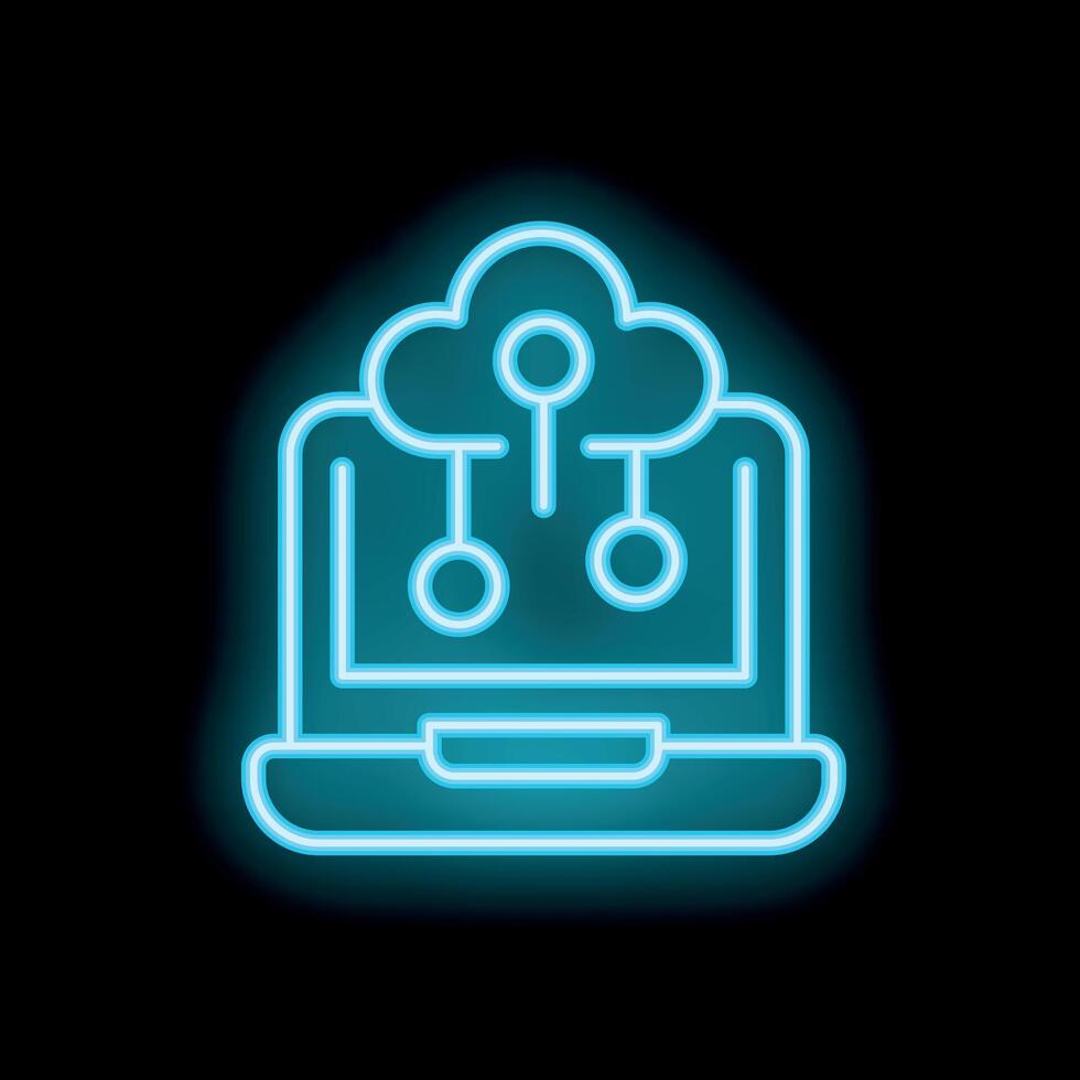 Neon blue cloud computing icon showing data flowing to laptop computer Pro Vector