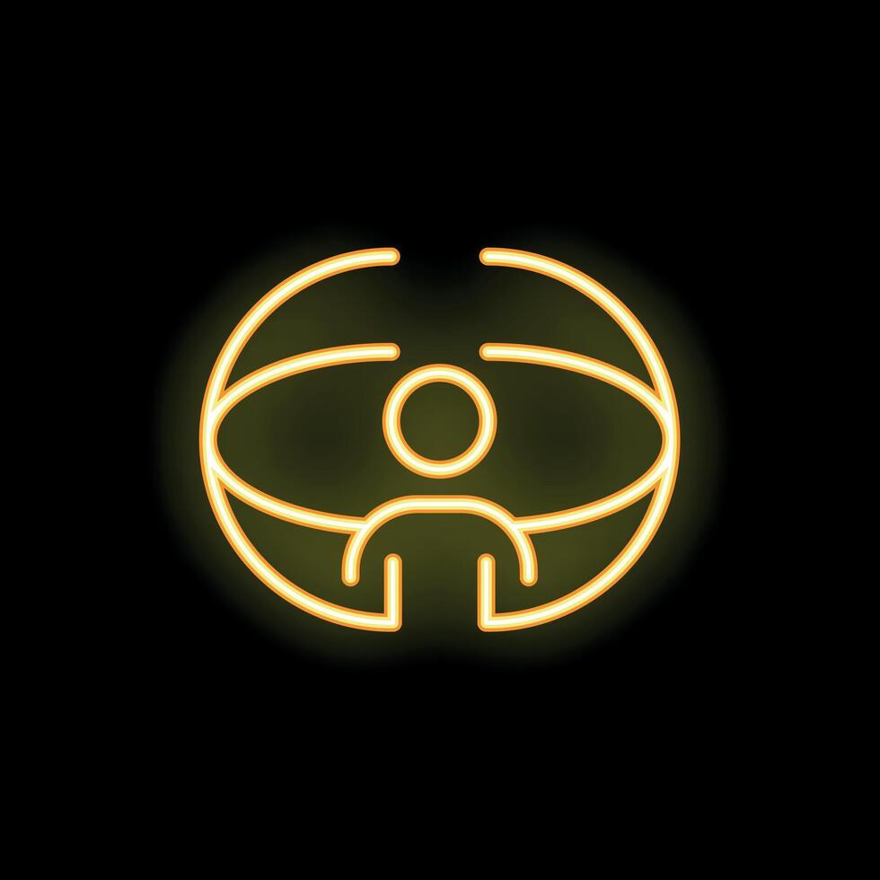 Neon icon of a person standing inside a rotating globe representing global business Pro Vector