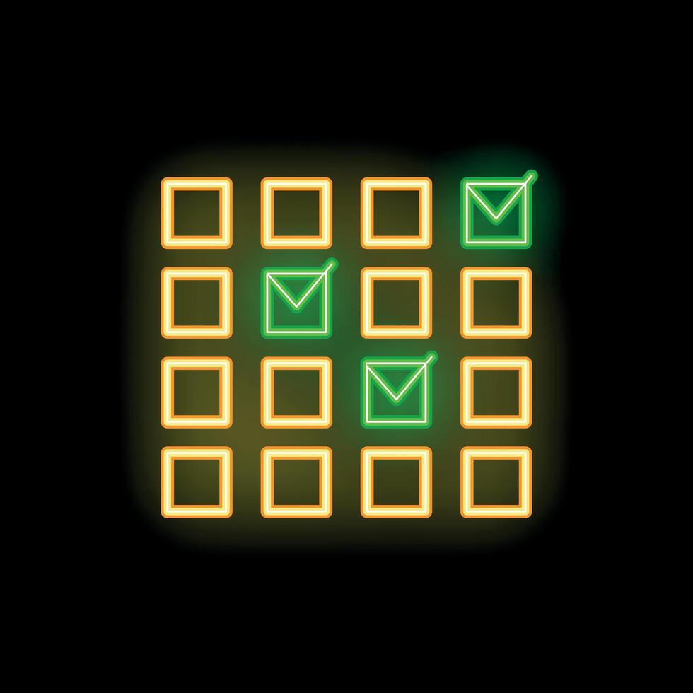 Neon green check mark icon in yellow checkbox grid on black background Pro Vector