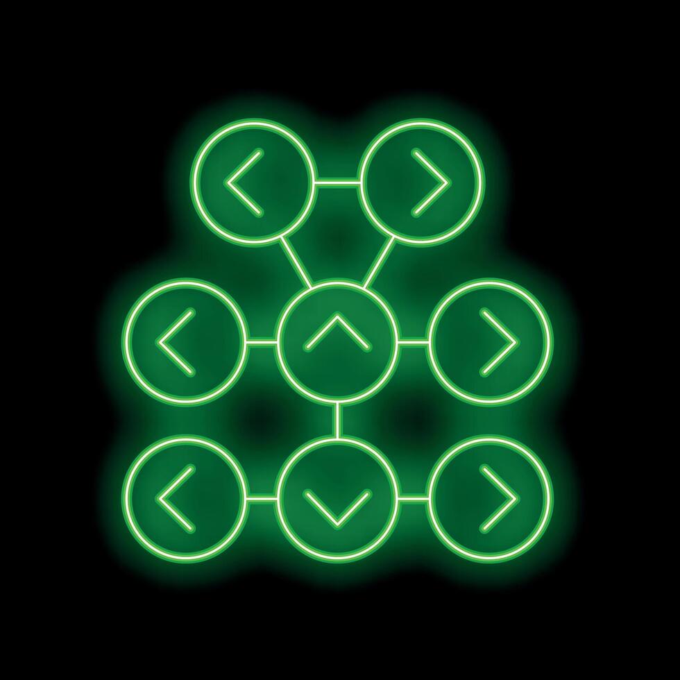 Neon green flowchart with arrows showing possible directions on black background Pro Vector