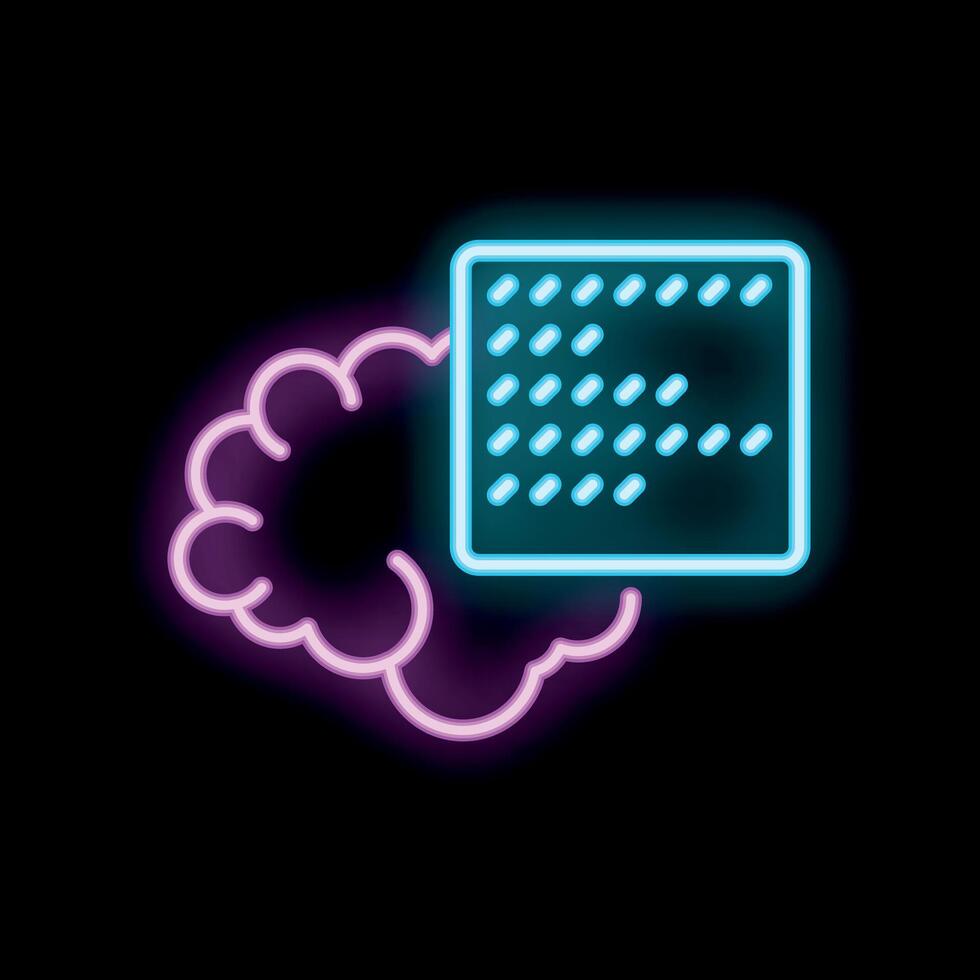 Neon icon of artificial intelligence processing data with a microchip and brain Pro Vector