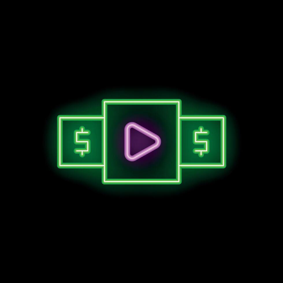 Neon icon of play button between two dollar signs representing paid content Pro Vector