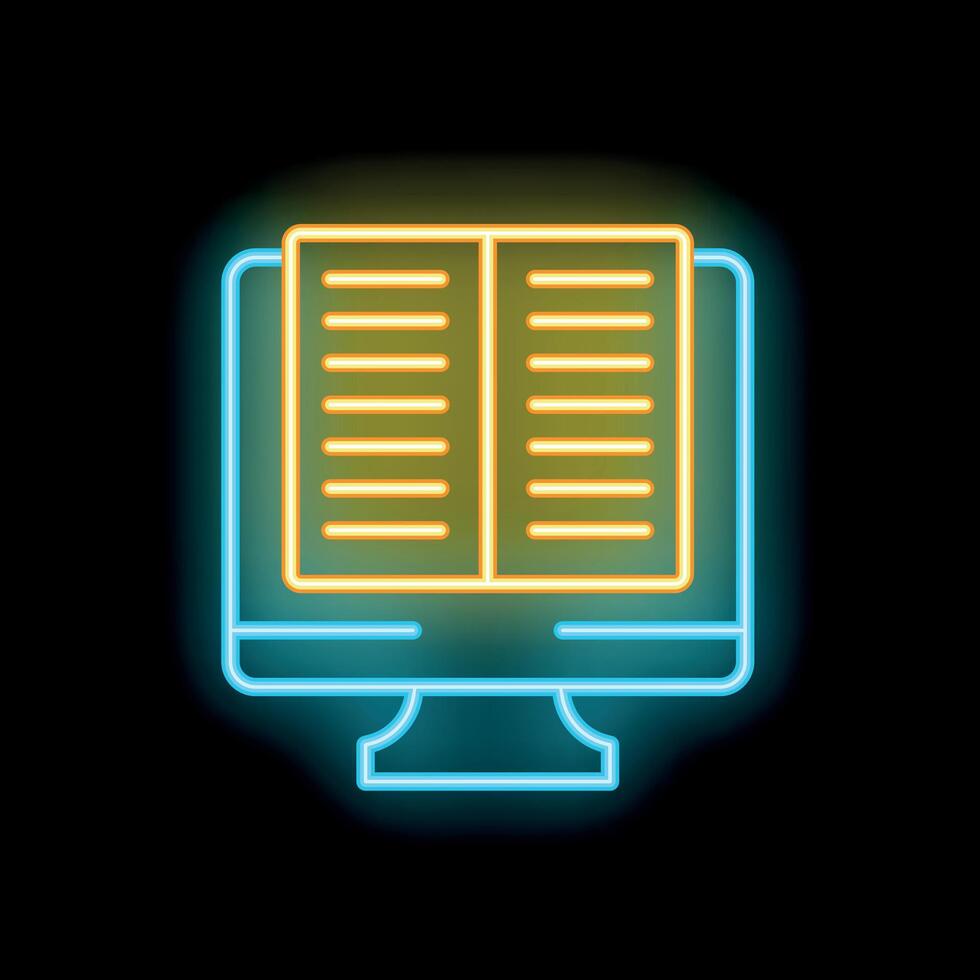 Neon icon of computer screen displaying open book for e learning Pro Vector