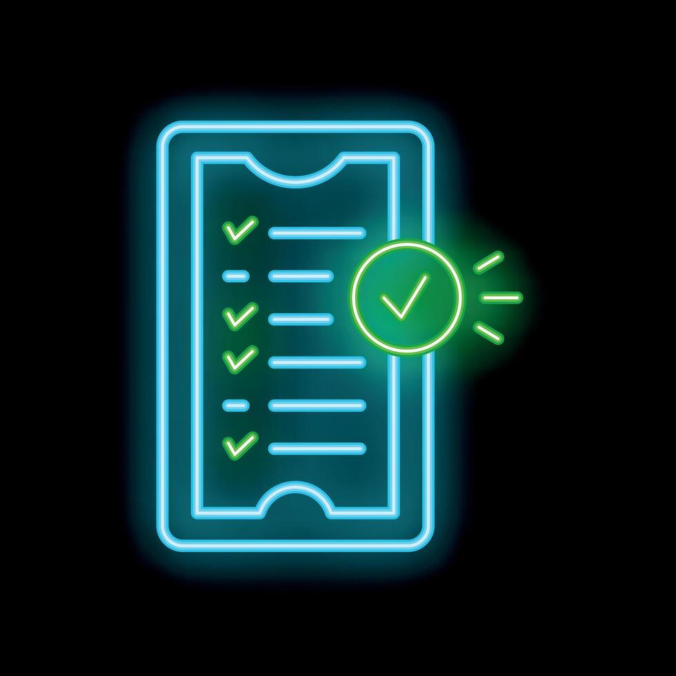 Neon icon representing mobile phone displaying completed checklist on dark background Pro Vector