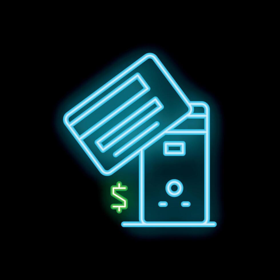 Neon style icon of credit card hovering over computer representing online payment Pro Vector
