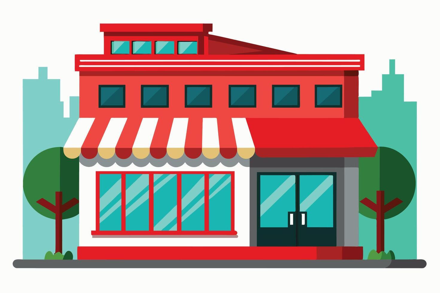 A bright red storefront with large windows and a striped awning in an urban setting during daylight hours vector