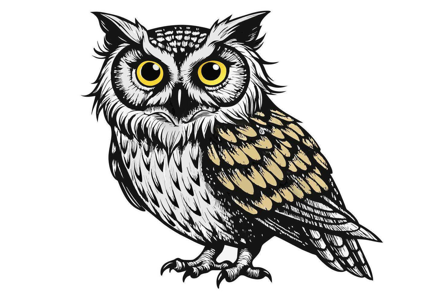 A detailed illustration of a wise owl perched on a branch, showcasing its striking yellow eyes and intricate feather patterns vector