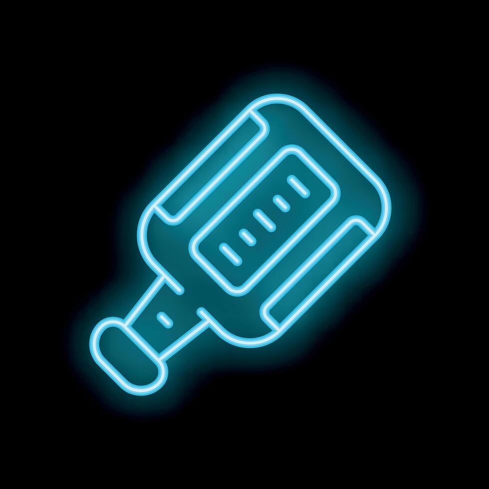Blue neon sign showing a retro portable cassette player and recorder on black background Pro Vector