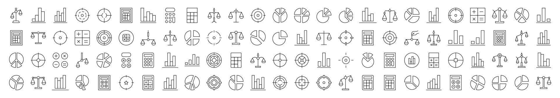 Scales, Target, Calculator, Diagram, Business Line Icon Set. Editable Stroke. Minimalistic Linear Pictogram for Design of Cards, Apps, Banners, Posts Pro Vector