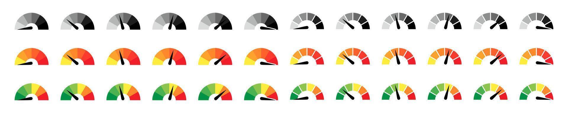 Gauge with arrow big set. Measurement gauges with arrows gradient collection. Pro Vector