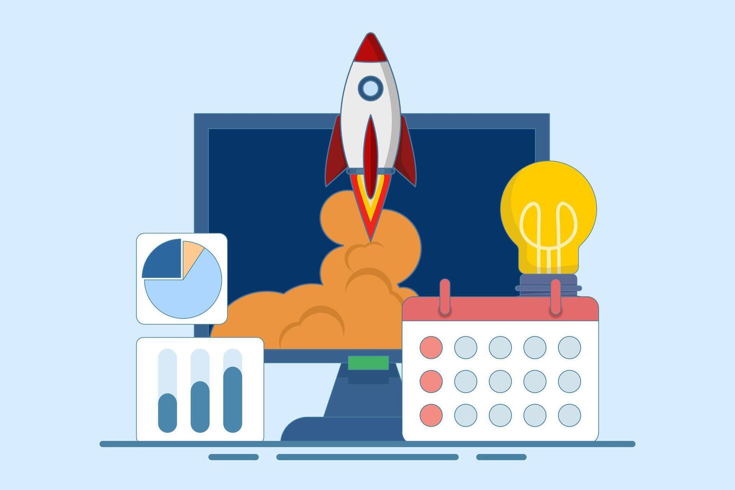 Startup business project concept, Rocket launch from monitor, Startup business project, realization and success, financial planning, idea, strategy, management. flat illustration on background. Pro Vector