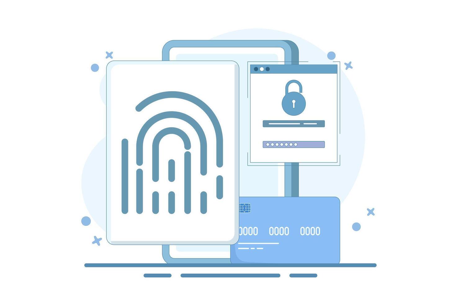 Concept of data protection with fingerprint. Biometric security system. Personal data protection, biometric lock. Data and account protection with fingerprint scanner. Flat illustration. Pro Vector