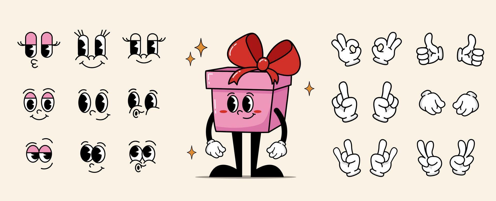 Retro character creation kit cute gift box with different facial expressions and poses Constructor. collection of nostalgic characters in 70s or 60s style Pro Vector