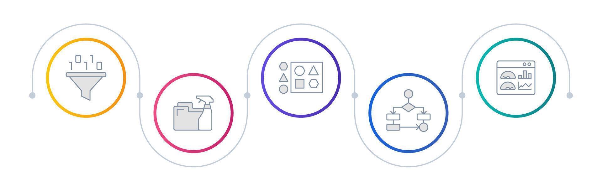 Machine learning difficulties infographic circles. Cleaning data, feature engineering. Defining model. Editable thin line icons diagram process with 5 steps Pro Vector