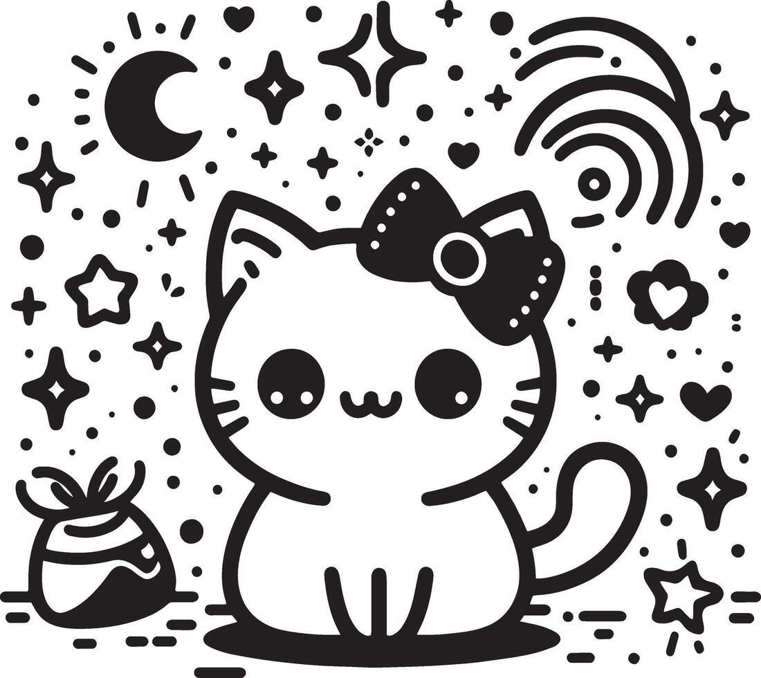 a cat with a bow on its head sits in front of a white background with stars silhouette art style Pro Vector
