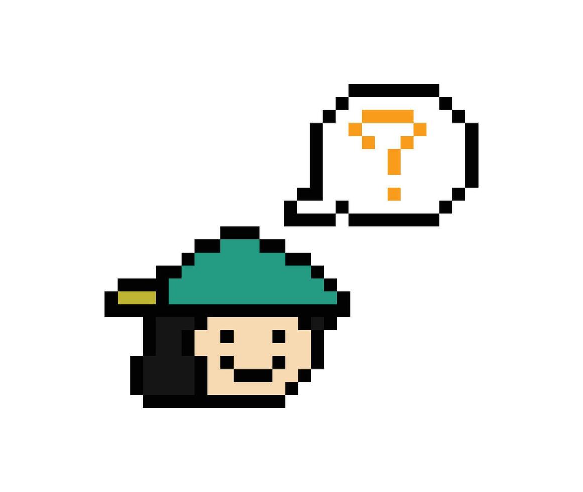 Design cartoon 8-bit about male man or boy with question mark confuse wonder don't know question pixel. Pro Vector