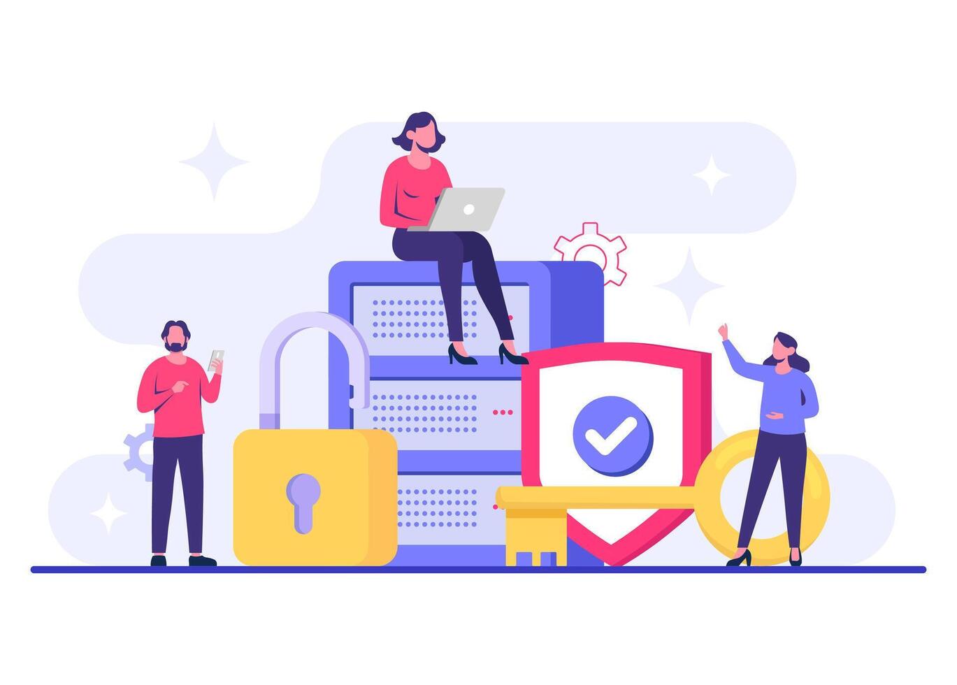 Cybersecurity-focused software engineers creating defense mechanisms, Database protection, Data Center, File management, cloud storage, Privacy data protection flat illustration Pro Vector