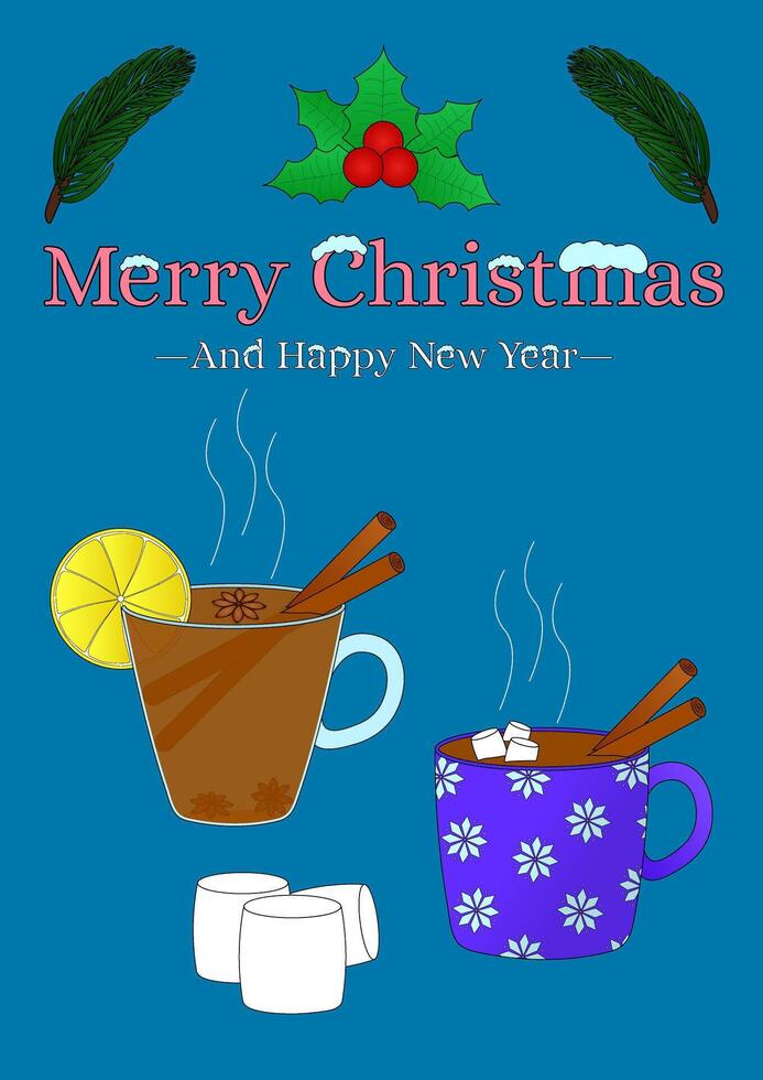 A festive holiday card design with steaming mugs of mulled wine and cocoa, cinnamon sticks, and marshmallows on a blue background. A3 postcard. Pro Vector