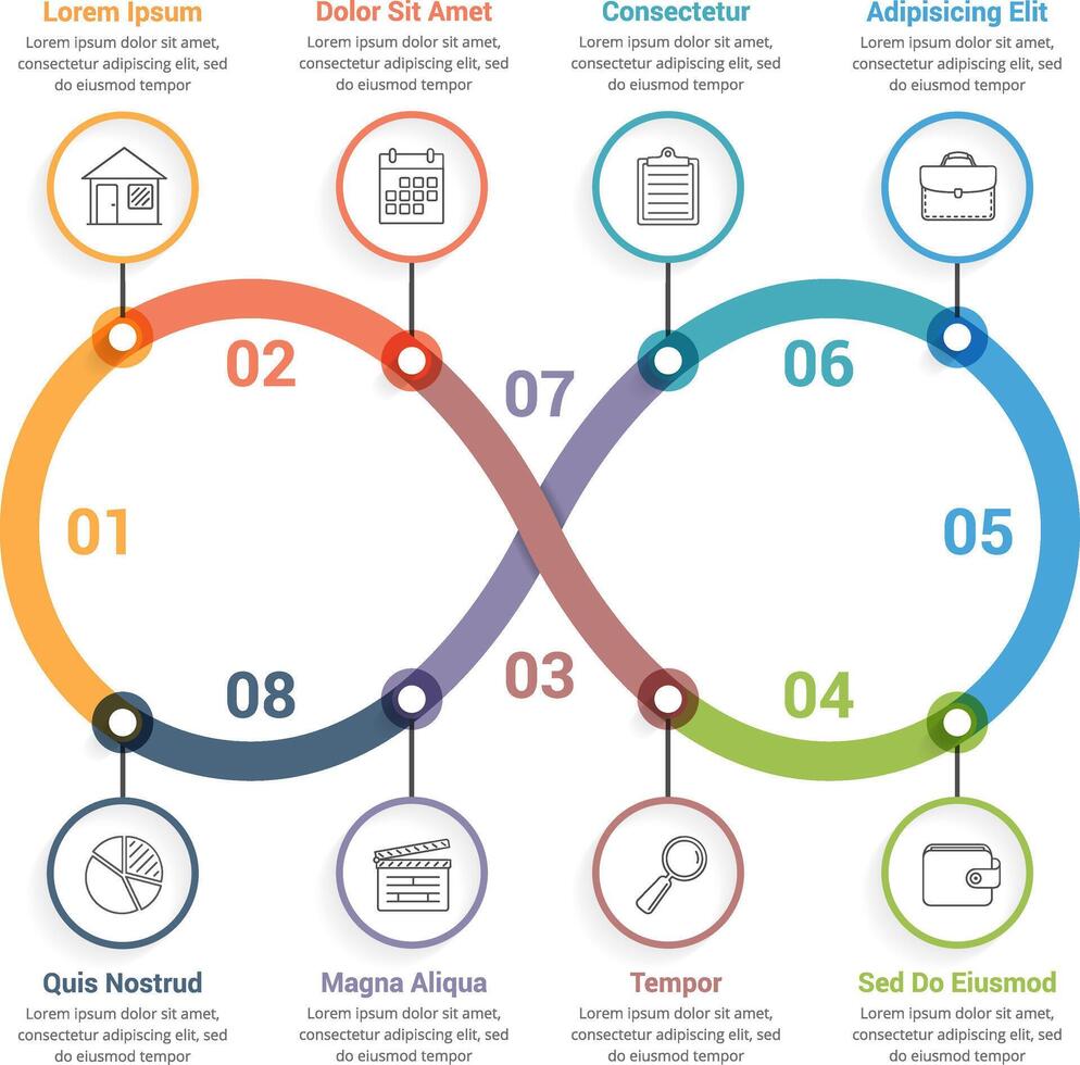 Process diagram with eight steps, infinity shape, workflow, steps, options Pro Vector