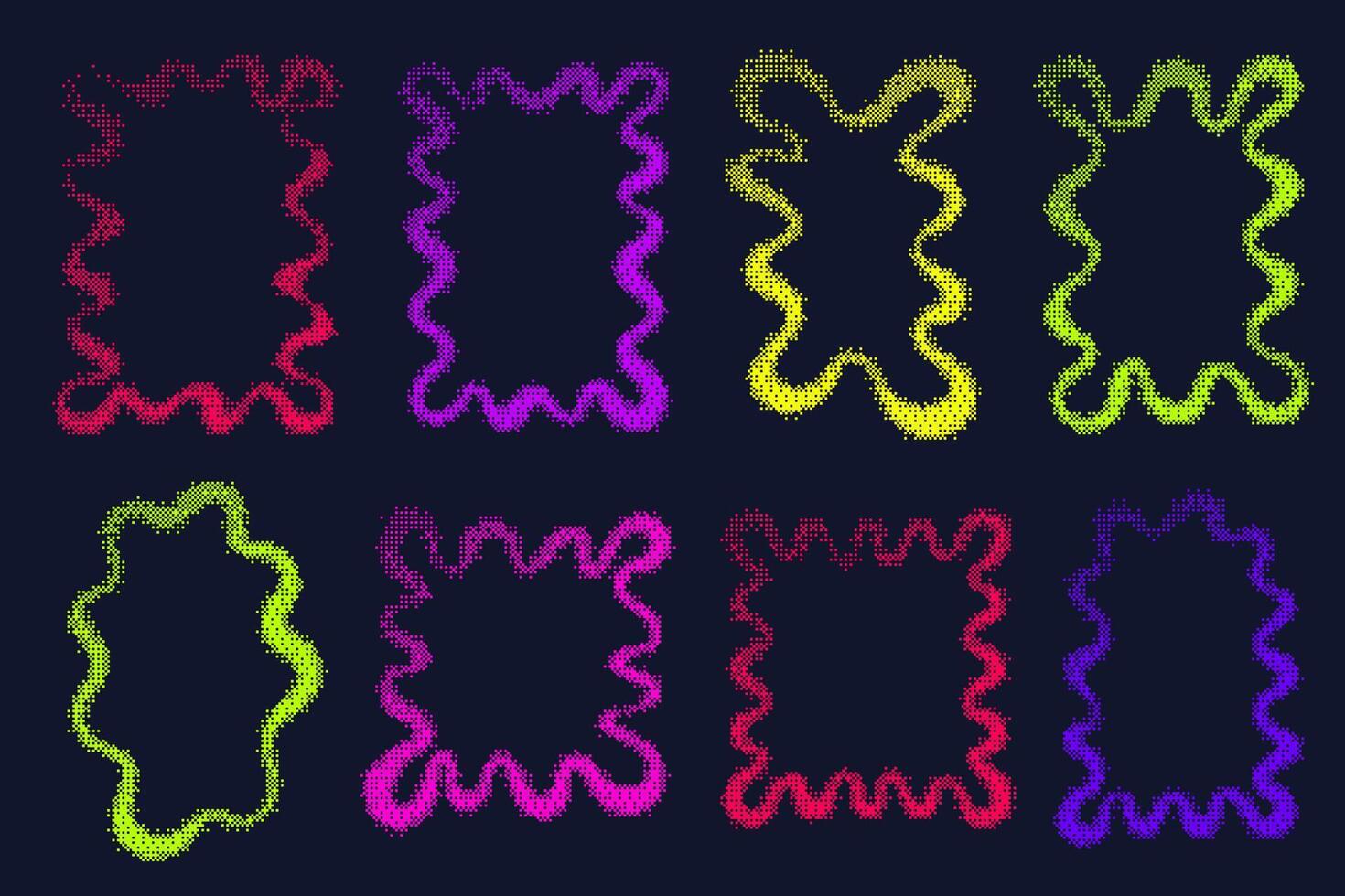 Pixel pattern texture wavy frame. Bitmap dotted retro abstract Y2K border. Neon grainy glitch shapes. Dither squiggle geometric elements Pro Vector