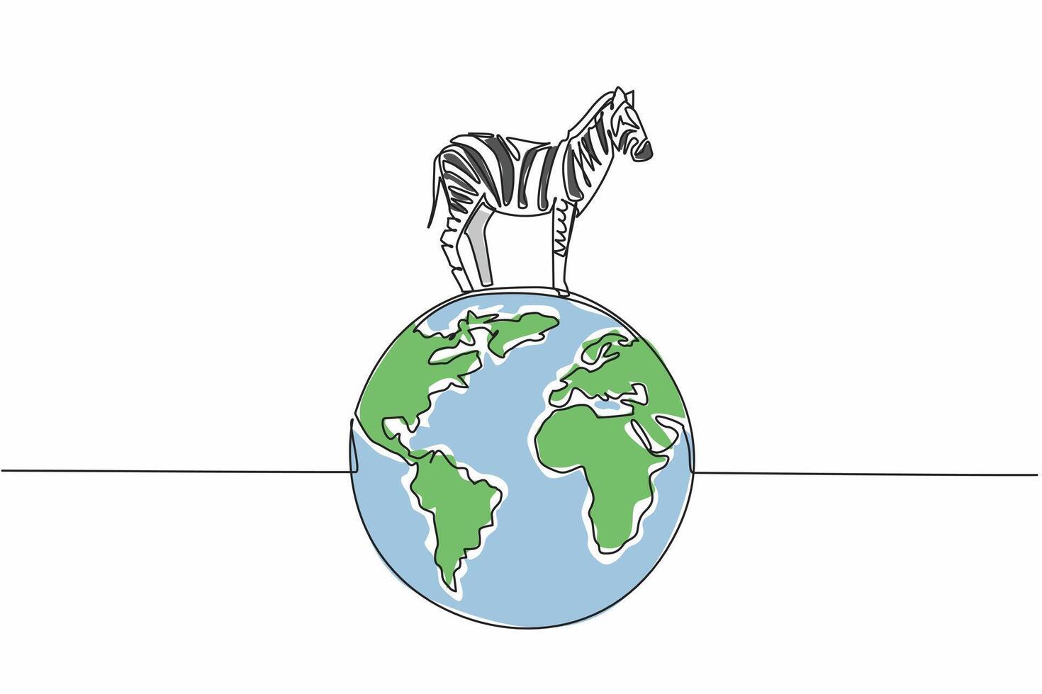 Single one line drawing globe with zebra on top. Environmental conservation is needed to keep them from becoming extinct. Good habitat. World Wildlife Day. Continuous line design graphic illustration Pro Vector