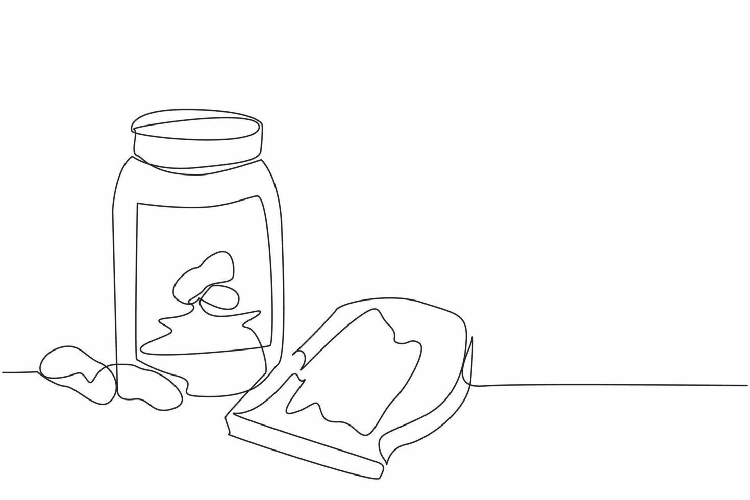 Single continuous line drawing jar of peanut butter and bread smeared with it. Scattered nut. Combination of deliciousness at breakfast. National Peanut Butter Day. One line design illustration Pro Vector