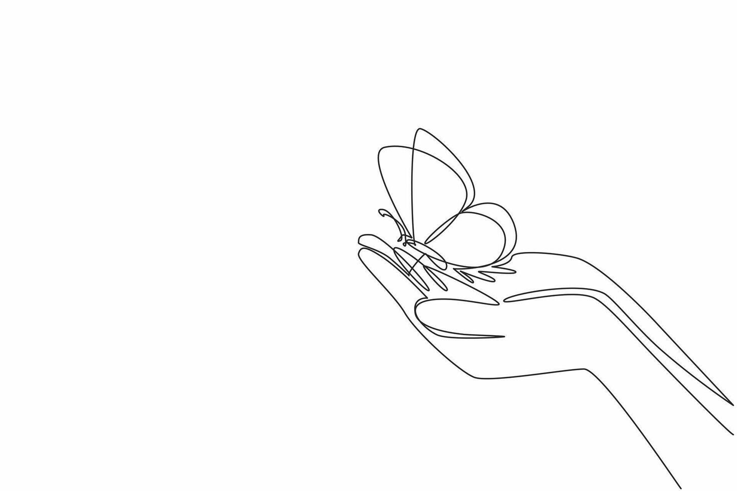 Single one line drawing butterflies flying on two open palms. Like holding up water as a source of life. There is the best hope. Zero Discrimination Day. Continuous line design graphic illustration Pro Vector