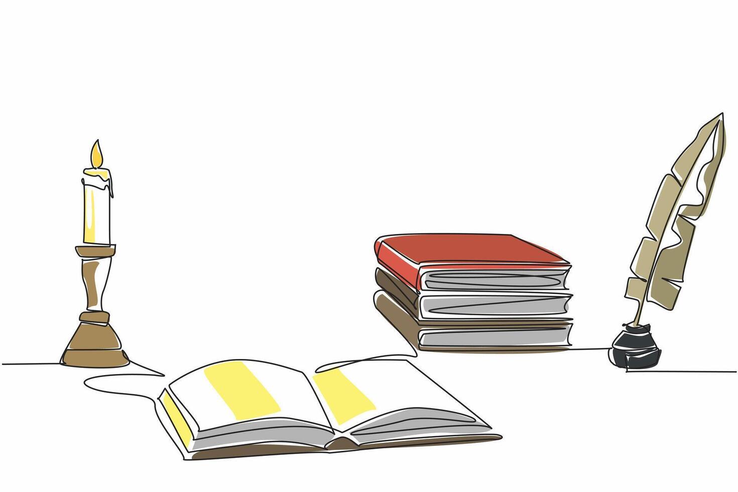 Continuous one line drawing open book, quill and lit candle in a candlestick. Reading. Studying. Learning. Writing. Increase knowledge. World Candle Day. Single line draw design illustration Pro Vector