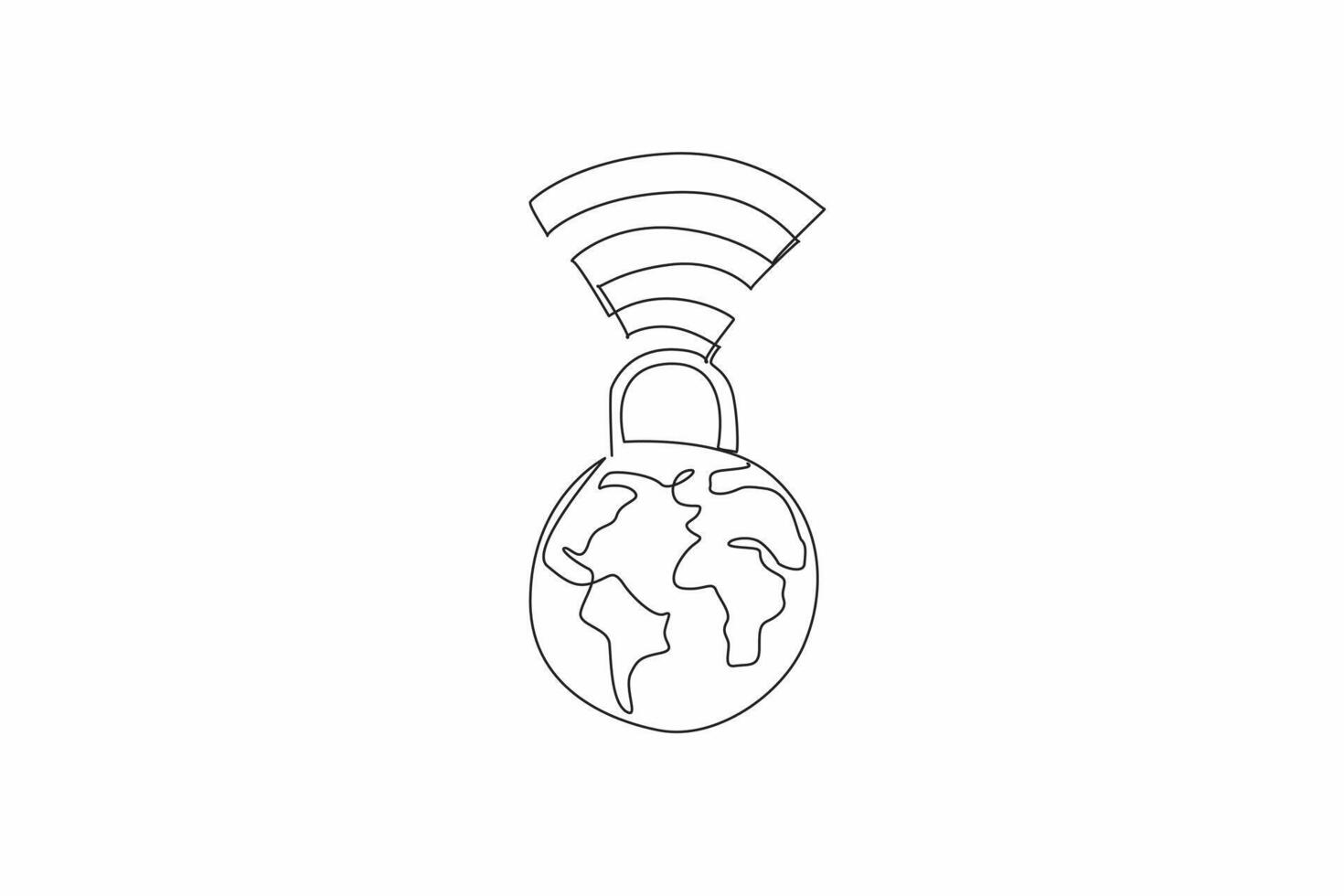 Single continuous line drawing a padlock connected to a globe with Wi-Fi signals. Safeguarding information in an interconnected world. Secure. Safer Internet Day. One line design illustration Pro Vector