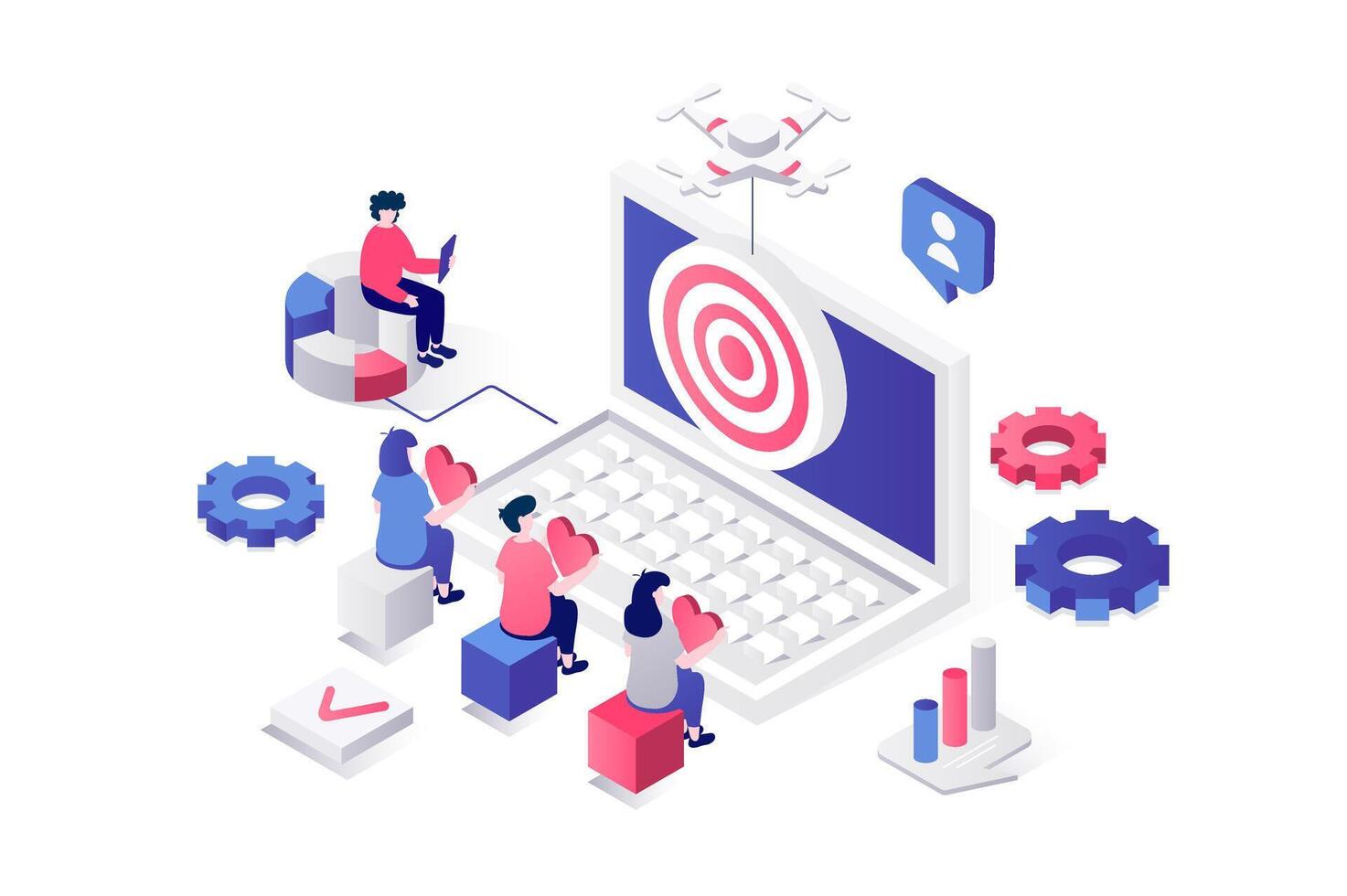 Target audience 3d isometric concept in geometry graphic design for web. People analyzing accurate target group, researching market and customers, creating promotion strategy. illustration. Pro Vector