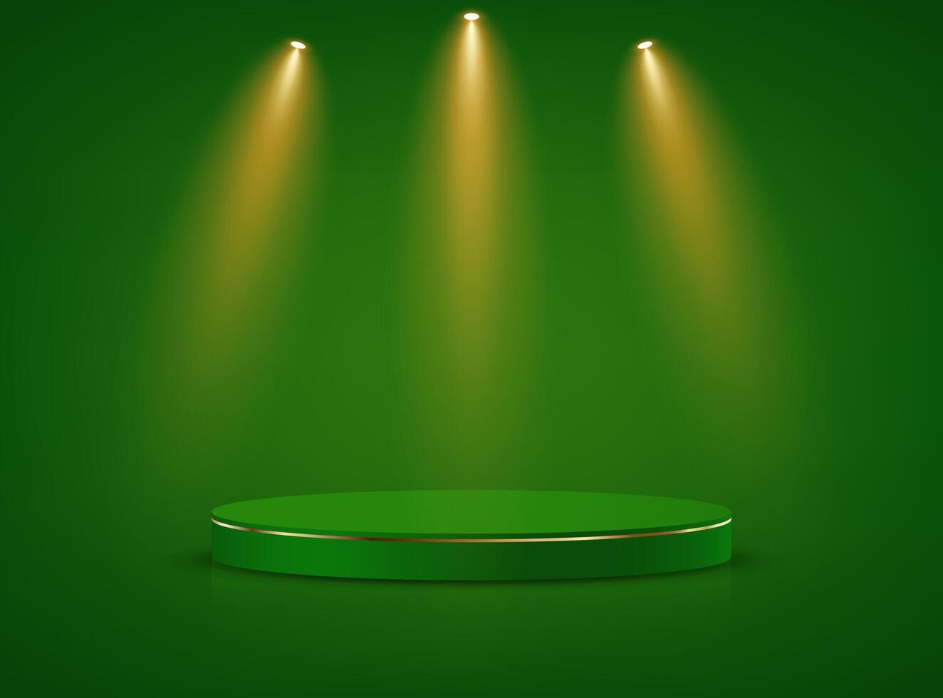 Green background 3d with green and gold podium for product presentation. Empty room with light effect. illustration. Pro Vector