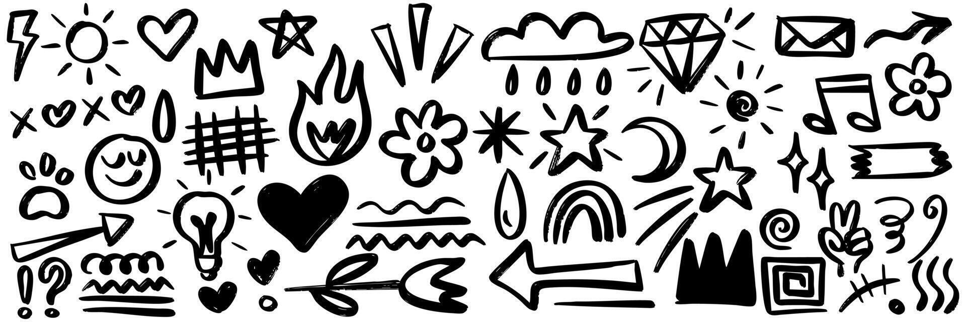 Bold brush Hand drawn doodle style collection of heart, scribble, star, check mark, spirals, sparkles, lightning, and emphasis element. use for concept design. Pro Vector