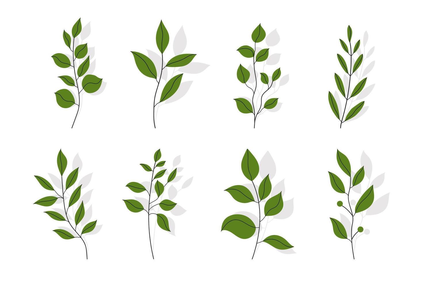 Branches with Leaves in Hand Drawn Flat Style. Branches of herbs isolated on white background. Botanical plants with leaves. Simple black ink greenery Pro Vector