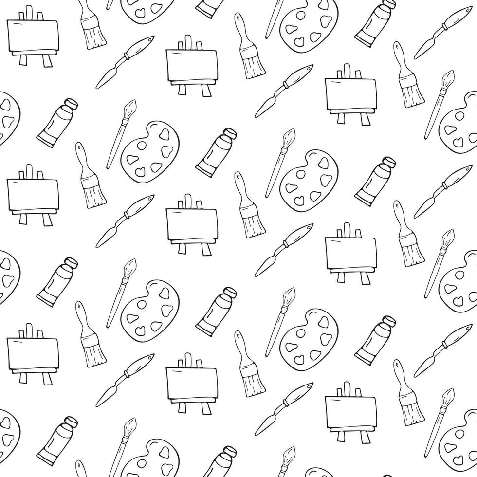 Seamless pattern with doodles of drawing palettes, brushes and paints on a white background. Pro Vector