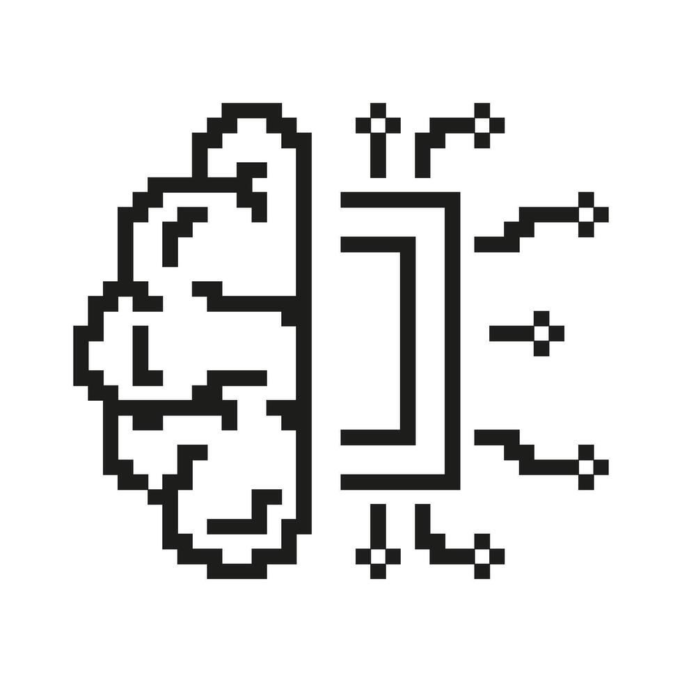 Pixelated Brain with Circuitry Icon. Artificial Intelligence and Machine Learning in Pixel Art Style. Hybrid Symbol of AI and Human Intelligence. Isolated Illustration Pro Vector