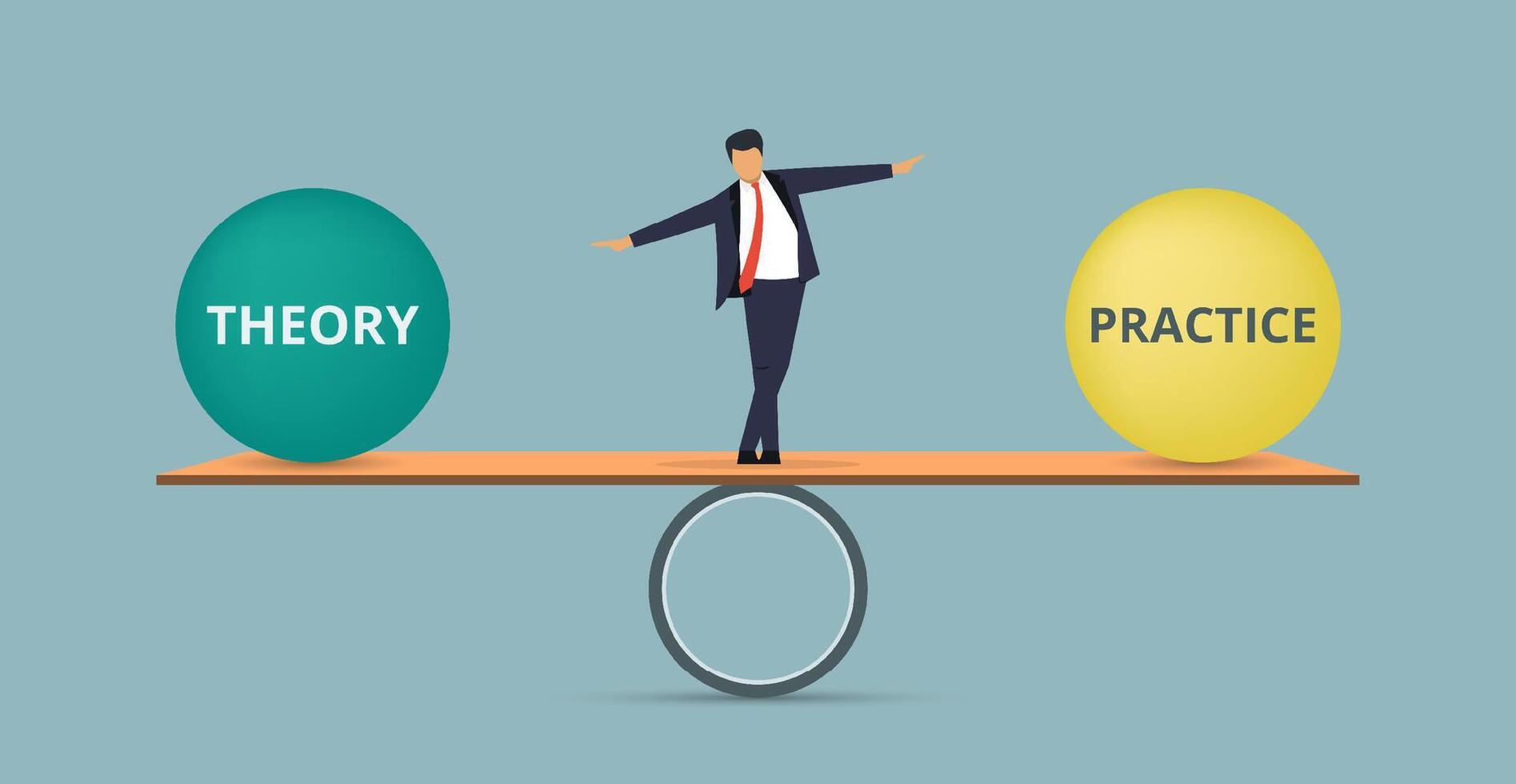 Theory and practice in balance. Businessman's balancing balls on scale that symbolize harmony and equity between Theory and practice that is good and beneficial Pro Vector