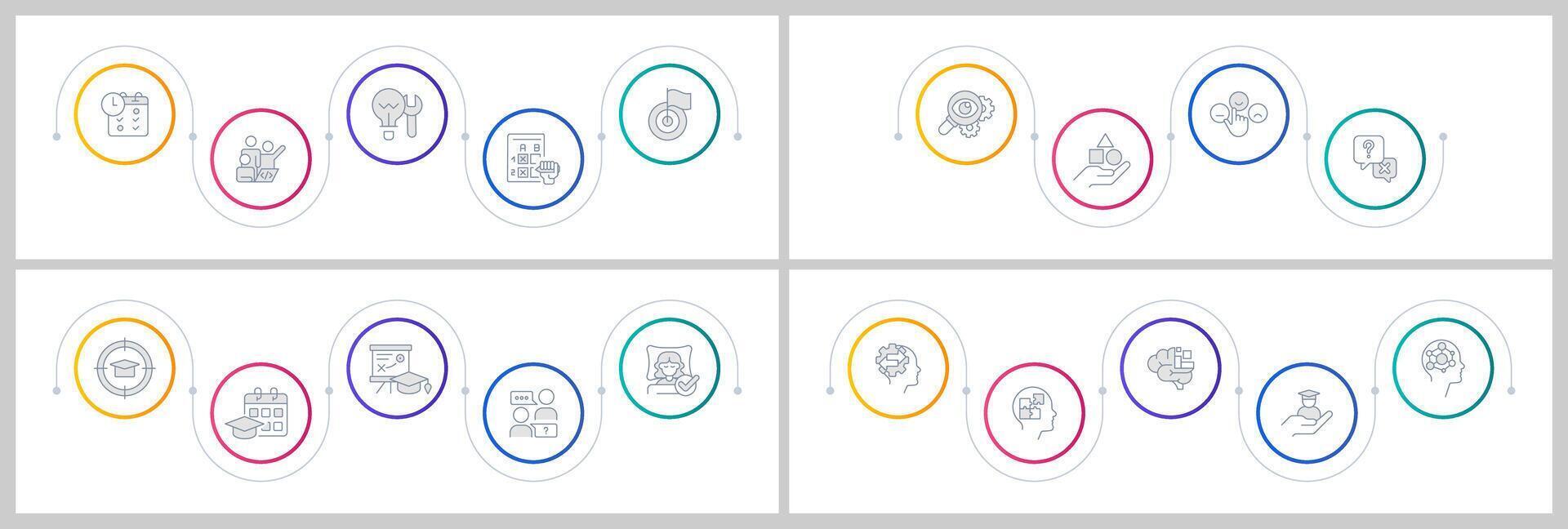 Learning strategies infographics circles set. Studying theories, education. Editable thin line icons diagrams process with steps collection Pro Vector