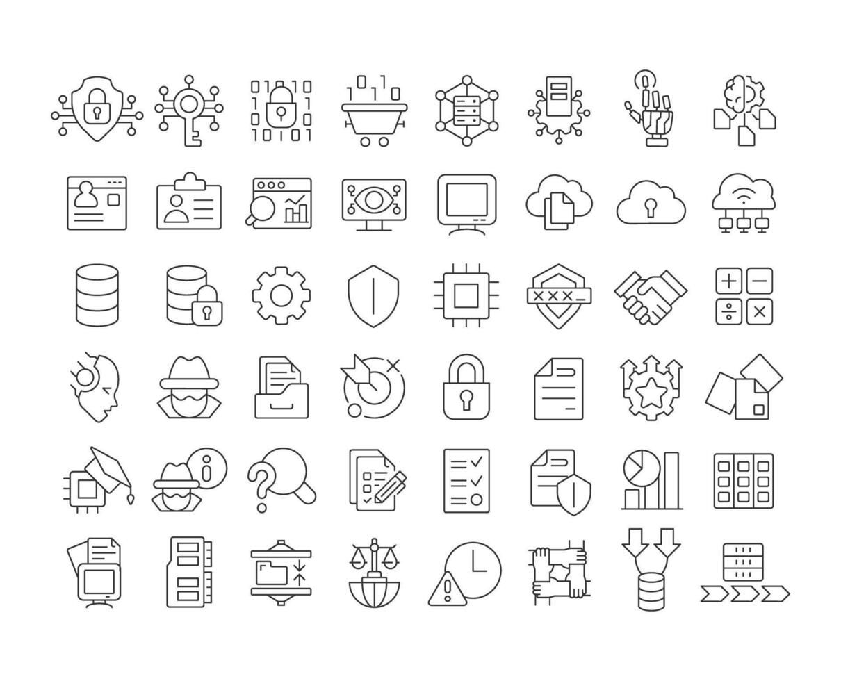 Privacy-enhancing technologies linear icons set. Data security, protection and encryption. Cybersecurity. Customizable thin line symbols. Isolated outline illustrations. Editable stroke Pro Vector