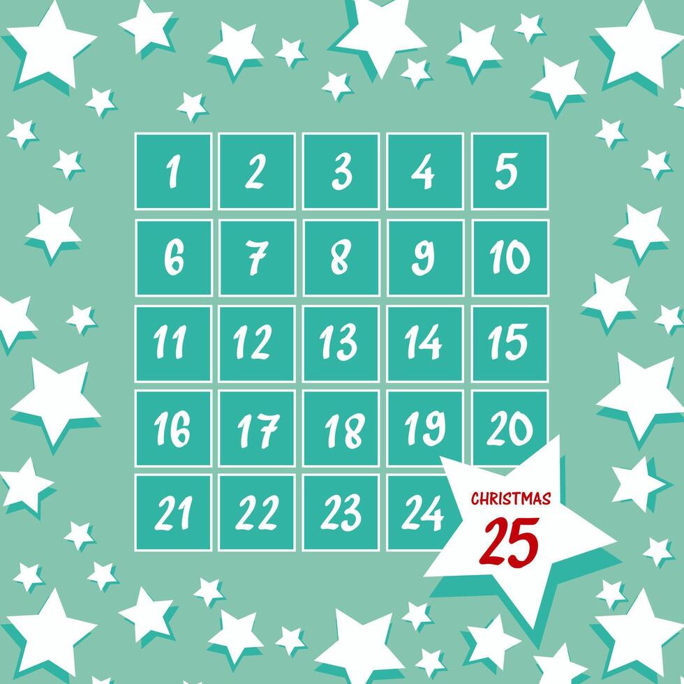 Square advent calendar in a frame of white stars on a green with a red Christmas date Pro Vector