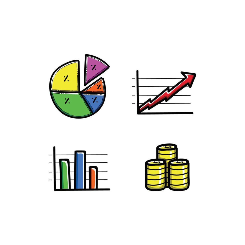 Illustration of business icons featuring a pie chart, bar graph, line chart, and stack of coins, symbolizing financial growth and analysis. Pro Vector