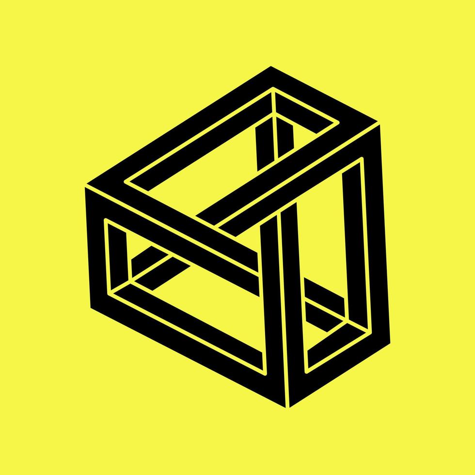 Impossible shape. Sacred geometry figure. Optical illusion. Abstract eternal geometric object. Impossible endless outline. Optical art. Impossible geometry shape on a yellow background. Pro Vector
