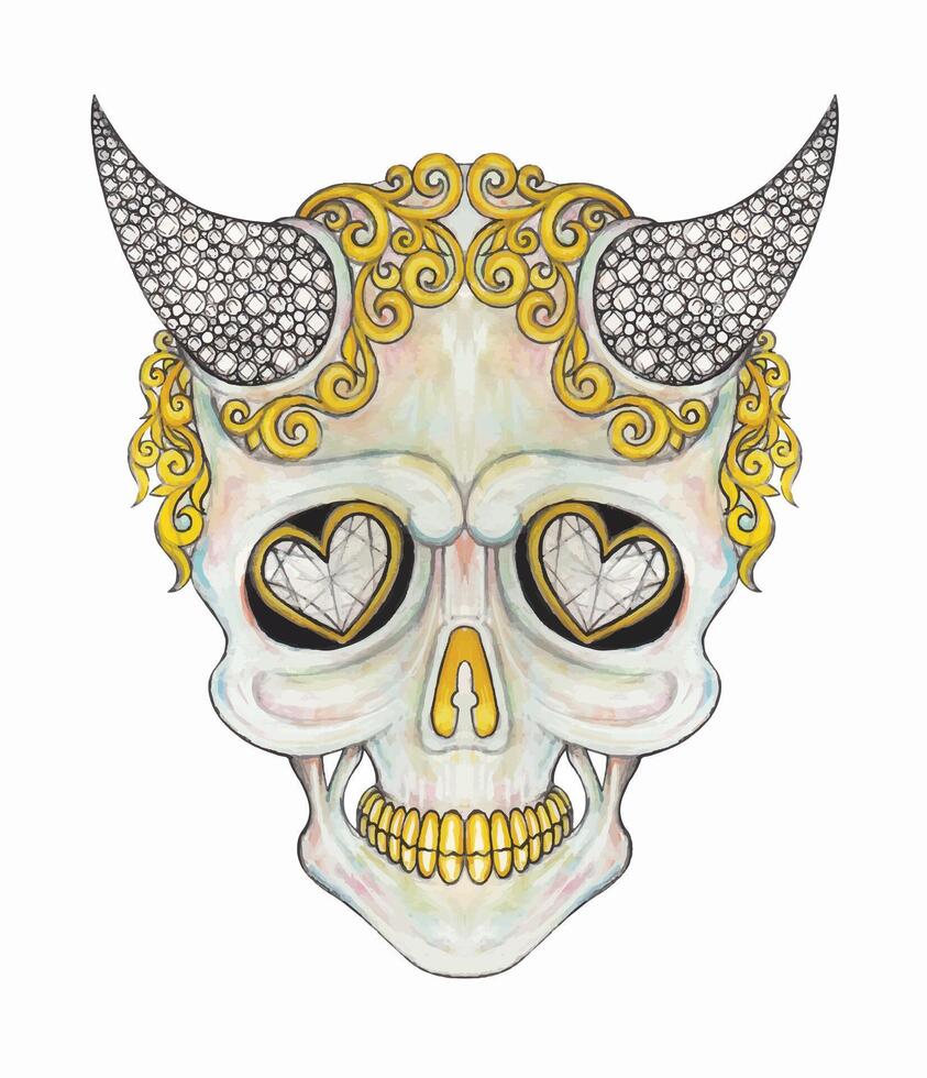Golden horned sugar skull day of the dead. A striking sugar skull design adorned with elaborate golden curls and prominent horns textured with intricate net-like patterns. Pro Vector