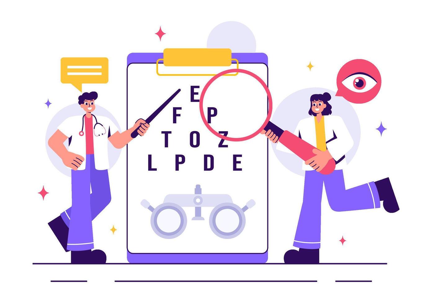 Optometry Illustration with Eye Testing Procedures and Spectacles in a Modern Flat Cartoon Background Pro Vector
