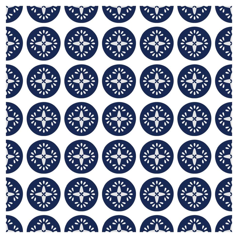 geometric circle with flower print pattern, A blue and white repeating circular pattern on a square fabric. vector