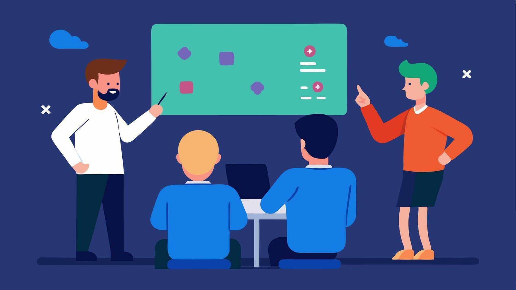 Team Strategy Session A coach stands at a large gaming table pointing towards a digital screen filled with game maps and statistics while the team huddles around taking notes.. Pro Vector
