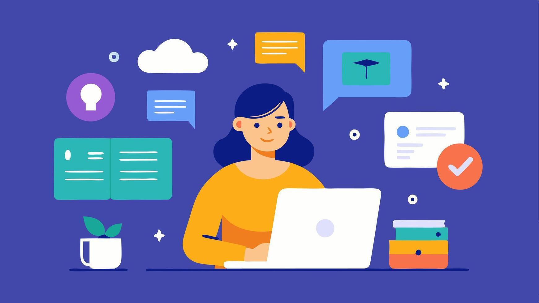 Social Media Management A virtual assistant looking at a computer screen with open social media apps thoughtfully strategizing over content creation and scheduling.. Pro Vector